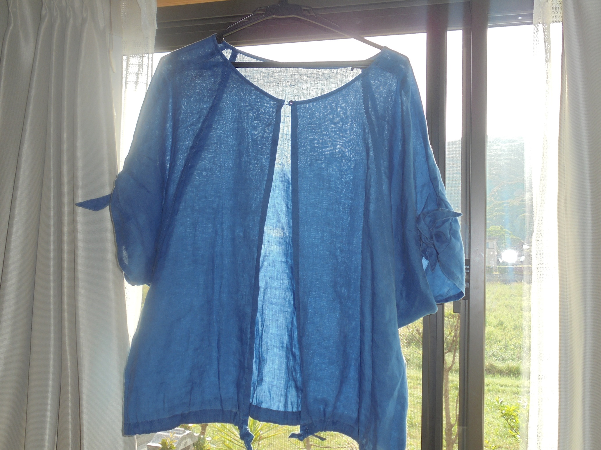 頭からすっぽりかぶるタイプでしたが、とても大きかったので、前見頃の中心を、ハサミでジョキ、ジョキ切り開いて、ボタンを付けて手縫いでカーデガンブラウスに変身させました。
