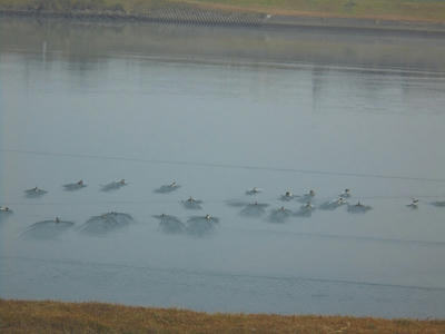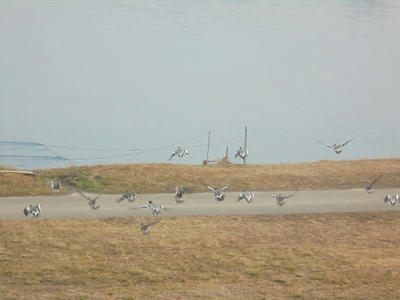 最初は、気がつかずに、足音に注意を払わなかったので、鴨が一斉に飛び立ち、川面に泳いで逃げていきました。