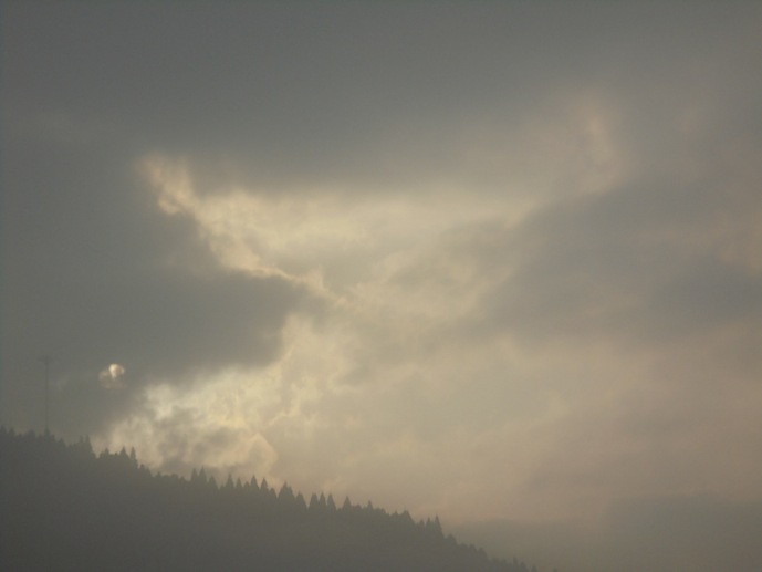 太陽が左下に雲の間から見えます。