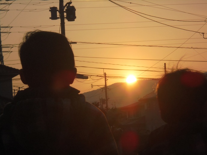 朝日を眺める5歳と3歳の子供たちは、お兄ちゃんになることの覚悟をしているかのように見えます。