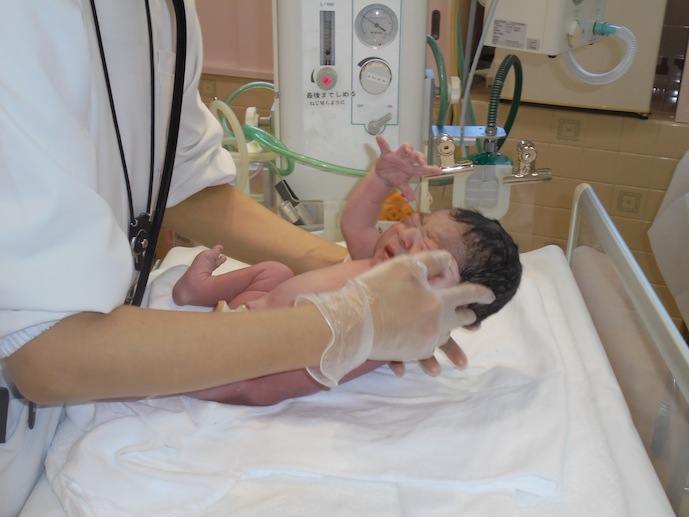 とても元気な赤ちゃんは、生まれたての身体を看護師さんにきれいにしてもらっています。
