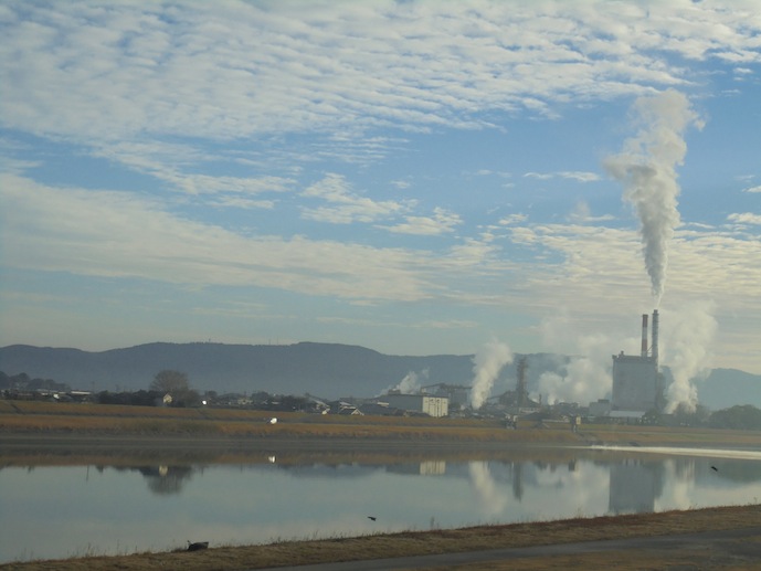 対岸にあるチップ工場の煙突から煙がモコモコ立ち上がっていました。