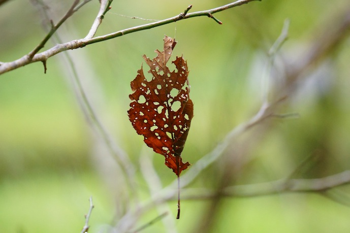 虫にかじられた枯れ葉が、最後まで自分の身を他のために使い、満足している姿は、どことなく誇らしげに映ります。